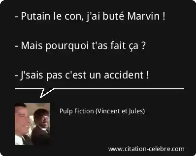 Citation  Pulp Fiction con : - Putain le con, j'ai buté Marvin ! - Mais pourquoi... (Vincent et Jules - film & série)