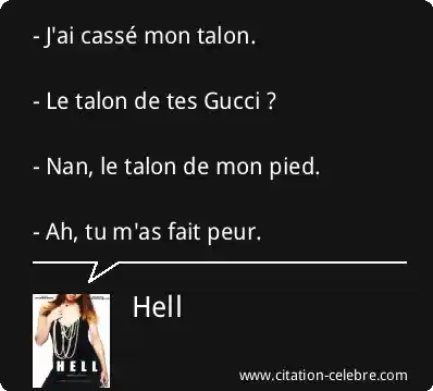 - J'ai cassé mon talon. - Le talon de tes Gucci ? - Nan, le talon de mon pied. - Ah, tu m'as fait peur.