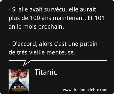 - Si elle avait survécu, elle aurait plus de 100 ans maintenant. Et 101 an le mois prochain. - D'accord, alors c'est une putain de très vieille menteuse.