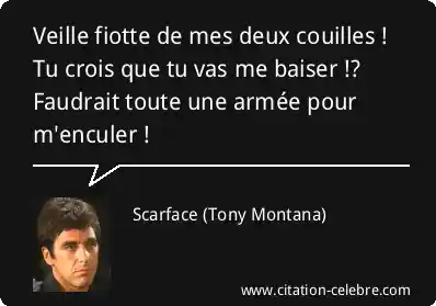 Veille fiotte de mes deux couilles ! Tu crois que tu vas me baiser !? Faudrait toute une armée pour m'enculer !