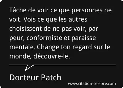 Tâche de voir ce que personnes ne voit. Vois ce que les autres choisissent de ne pas voir, par peur, conformiste et paraisse mentale. Change ton regard sur le monde, découvre-le.