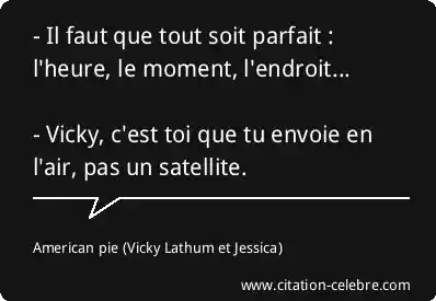 - Il faut que tout soit parfait : l'heure, le moment, l'endroit... - Vicky, c'est toi que tu envoie en l'air, pas un satellite.