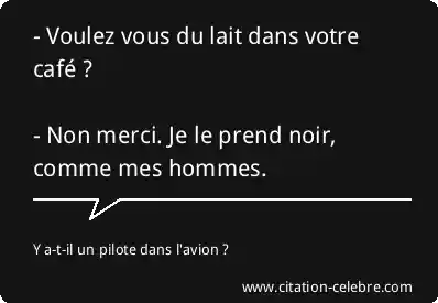 - Voulez vous du lait dans votre café ? - Non merci. Je le prend noir, comme mes hommes.