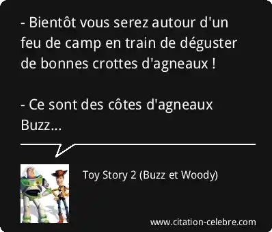 - Bientôt vous serez autour d'un feu de camp en train de déguster de bonnes crottes d'agneaux ! - Ce sont des côtes d'agneaux Buzz...