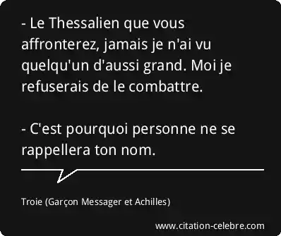 - Le Thessalien que vous affronterez, jamais je n'ai vu quelqu'un d'aussi grand. Moi je refuserais de le combattre. - C'est pourquoi personne ne se rappellera ton nom.