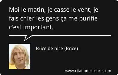 La phrase "Moi le matin, je casse le vent, je fais chier les gens ça me purifie c'est important" est, dans son sens le plus direct, l'expression d'un rituel matinal très personnel. La locution "casser le vent" est ici utilisée dans son sens imagé de prendre de l'élan, de se donner une impulsion, bien que l'interprétation par le personnage soit souvent plus absurde. Le fait de "faire chier les gens" signifie simplement déranger, agacer, provoquer les autres. L'action est présentée comme une nécessité, une "purification" essentielle au bien-être du personnage.