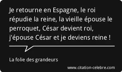 Je retourne en Espagne, le roi répudie la reine, la vieille épouse le perroquet, César devient roi, j'épouse César et je deviens reine !