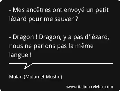 - Mes ancêtres ont envoyé un petit lézard pour me sauver ? - Dragon ! Dragon, y a pas d'lézard, nous ne parlons pas la même langue !
