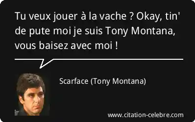 Tu veux jouer à la vache ? Okay, tin' de pute moi je suis Tony Montana, vous baisez avec moi !