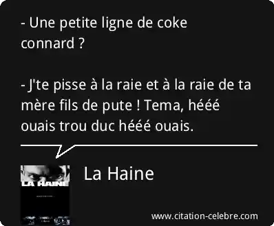 - Une petite ligne de coke connard ? - J'te pisse à la raie et à la raie de ta mère fils de pute ! Tema, hééé ouais trou duc hééé ouais.