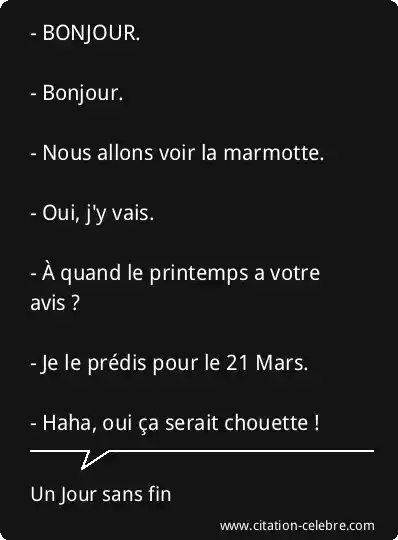 - BONJOUR. - Bonjour. - Nous allons voir la marmotte. - Oui, j'y vais. - À quand le printemps a votre avis ? - Je le prédis pour le 21 Mars. - Haha, oui ça serait chouette !