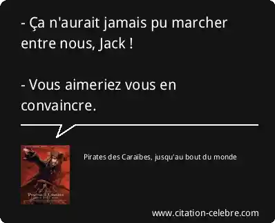 - Ça n'aurait jamais pu marcher entre nous, Jack ! - Vous aimeriez vous en convaincre.