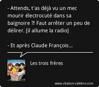 - Attends, t'as déjà vu un mec mourir électrocuté dans sa baignoire ?! Faut arrêter un peu de délirer. [il allume la radio] - Et après Claude François...