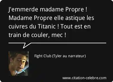 J'emmerde madame Propre ! Madame Propre elle astique les cuivres du Titanic ! Tout est en train de couler, mec !