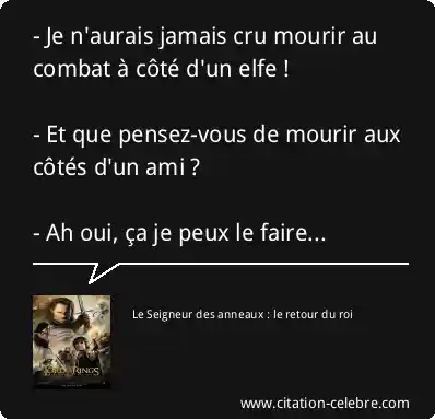 - Je n'aurais jamais cru mourir au combat à côté d'un elfe ! - Et que pensez-vous de mourir aux côtés d'un ami ? - Ah oui, ça je peux le faire...