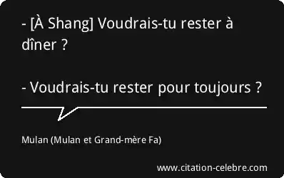 - [À Shang] Voudrais-tu rester à dîner ? - Voudrais-tu rester pour toujours ?