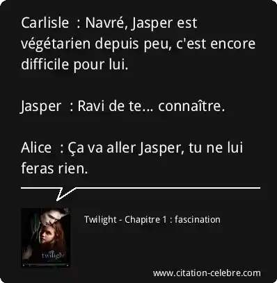 Carlisle : Navré, Jasper est végétarien depuis peu, c'est encore difficile pour lui. Jasper : Ravi de te... connaître. Alice : Ça va aller Jasper, tu ne lui feras rien.