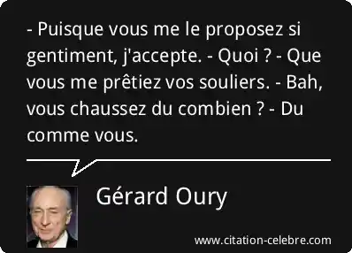 - Puisque vous me le proposez si gentiment, j'accepte. - Quoi ? - Que vous me prêtiez vos souliers. - Bah, vous chaussez du combien ? - Du comme vous.