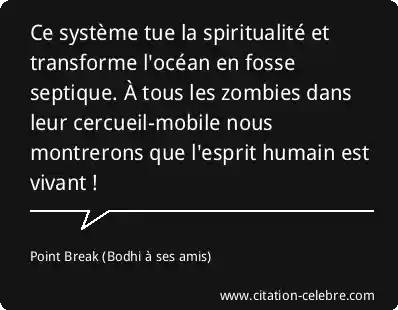 Ce système tue la spiritualité et transforme l'océan en fosse septique. À tous les zombies dans leur cercueil-mobile nous montrerons que l'esprit humain est vivant !