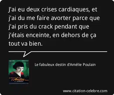 J'ai eu deux crises cardiaques, et j'ai du me faire avorter parce que j'ai pris du crack pendant que j'étais enceinte, en dehors de ça tout va bien.