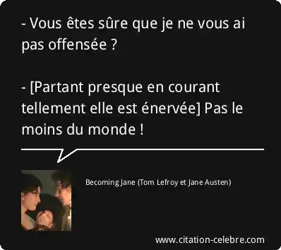 - Vous êtes sûre que je ne vous ai pas offensée ? - [Partant presque en courant tellement elle est énervée] Pas le moins du monde !