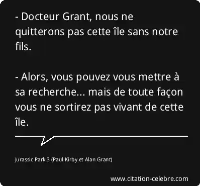 - Docteur Grant, nous ne quitterons pas cette île sans notre fils. - Alors, vous pouvez vous mettre à sa recherche... mais de toute façon vous ne sortirez pas vivant de cette île.