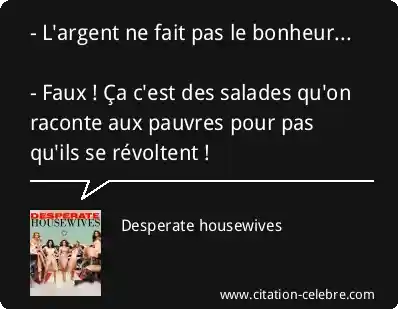 - L'argent ne fait pas le bonheur... - Faux ! Ça c'est des salades qu'on raconte aux pauvres pour pas qu'ils se révoltent !