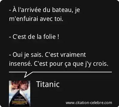 - À l'arrivée du bateau, je m'enfuirai avec toi. - C'est de la folie ! - Oui je sais. C'est vraiment insensé. C'est pour ça que j'y crois.