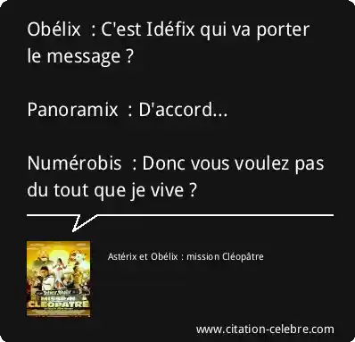 Obélix : C'est Idéfix qui va porter le message ? Panoramix : D'accord... Numérobis : Donc vous voulez pas du tout que je vive ?