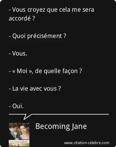 - Vous croyez que cela me sera accordé ? - Quoi précisément ? - Vous. - « Moi », de quelle façon ? - La vie avec vous ? - Oui.