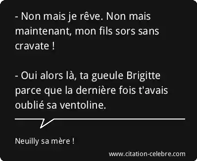 - Non mais je rêve. Non mais maintenant, mon fils sors sans cravate ! - Oui alors là, ta gueule Brigitte parce que la dernière fois t'avais oublié sa ventoline.