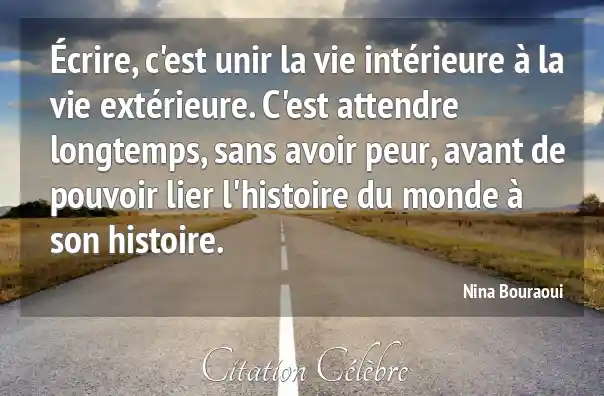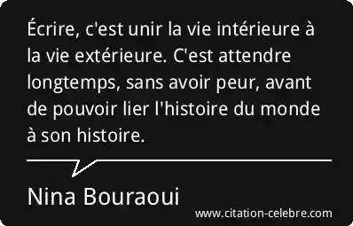 Écrire, c'est unir la vie intérieure à la vie extérieure. C'est attendre longtemps, sans avoir peur, avant de pouvoir lier l'histoire du monde à son histoire.