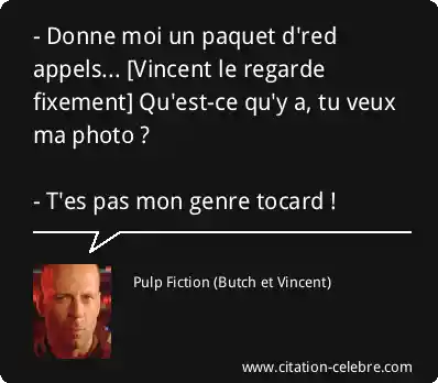 - Donne moi un paquet d'red appels... [Vincent le regarde fixement] Qu'est-ce qu'y a, tu veux ma photo ? - T'es pas mon genre tocard !