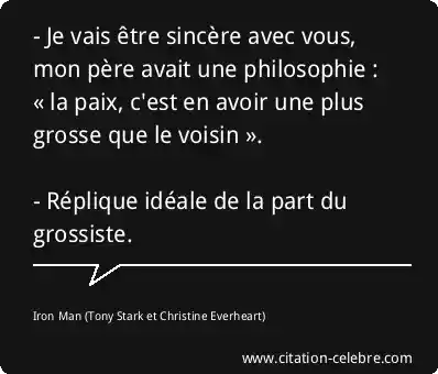 - Je vais être sincère avec vous, mon père avait une philosophie : « la paix, c'est en avoir une plus grosse que le voisin ». - Réplique idéale de la part du grossiste.