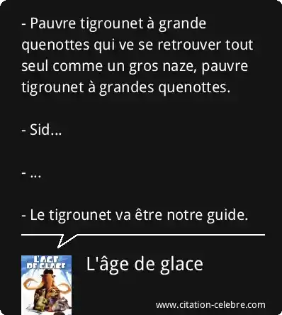 - Pauvre tigrounet à grande quenottes qui ve se retrouver tout seul comme un gros naze, pauvre tigrounet à grandes quenottes. - Sid... - ... - Le tigrounet va être notre guide.