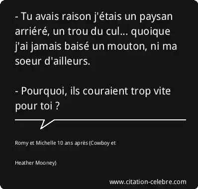 - Tu avais raison j'étais un paysan arriéré, un trou du cul... quoique j'ai jamais baisé un mouton, ni ma soeur d'ailleurs.