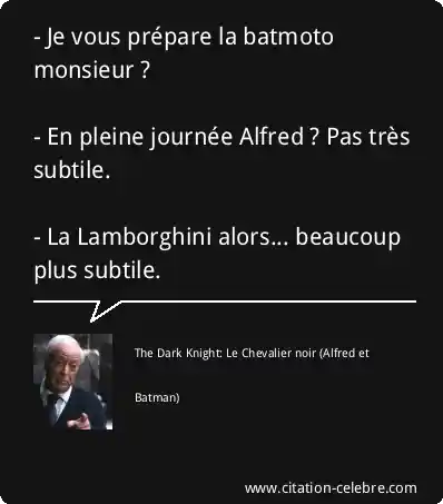 - Je vous prépare la batmoto monsieur ? - En pleine journée Alfred ? Pas très subtile. - La Lamborghini alors... beaucoup plus subtile.