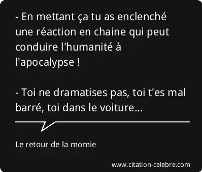 - En mettant ça tu as enclenché une réaction en chaine qui peut conduire l'humanité à l'apocalypse ! - Toi ne dramatises pas, toi t'es mal barré, toi dans le voiture...