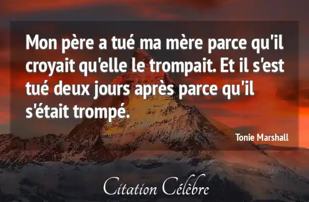 Mon père a tué ma mère parce qu'il croyait qu'elle le trompait. Et il s'est tué deux jours après parce qu'il s'était trompé.