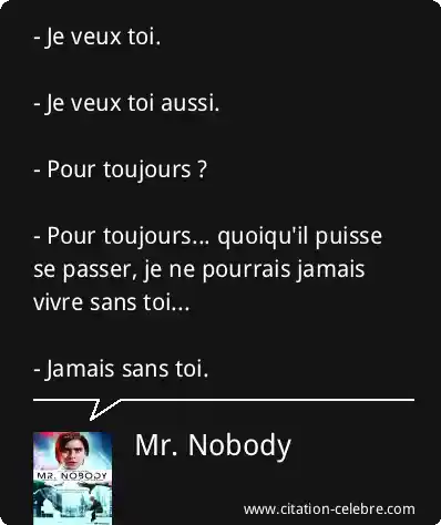 - Je veux toi. - Je veux toi aussi. - Pour toujours ? - Pour toujours... quoiqu'il puisse se passer, je ne pourrais jamais vivre sans toi... - Jamais sans toi.