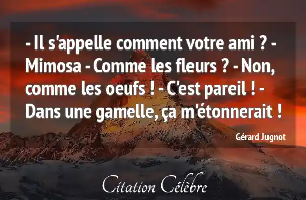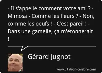 - Il s'appelle comment votre ami ? - Mimosa - Comme les fleurs ? - Non, comme les oeufs ! - C'est pareil ! - Dans une gamelle, ça m'étonnerait !