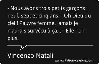 - Nous avons trois petits garçons : neuf, sept et cinq ans. - Oh Dieu du ciel ! Pauvre femme, jamais je n'aurais survécu à ça... - Elle non plus.