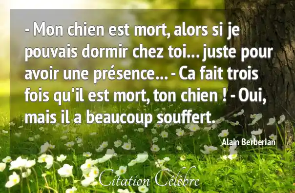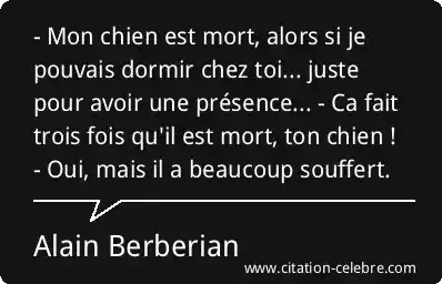 - Mon chien est mort, alors si je pouvais dormir chez toi... juste pour avoir une présence... - Ca fait trois fois qu'il est mort, ton chien ! - Oui, mais il a beaucoup souffert.