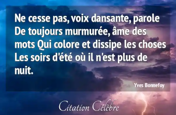 Ne cesse pas, voix dansante, parole De toujours murmurée, âme des mots Qui colore et dissipe les choses Les soirs d'été où il n'est plus de nuit.