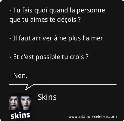 - Tu fais quoi quand la personne que tu aimes te déçois ? - Il faut arriver à ne plus l'aimer. - Et c'est possible tu crois ? - Non.