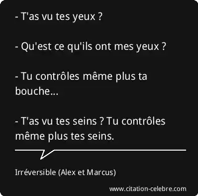 - T'as vu tes yeux ? - Qu'est ce qu'ils ont mes yeux ? - Tu contrôles même plus ta bouche... - T'as vu tes seins ? Tu contrôles même plus tes seins.
