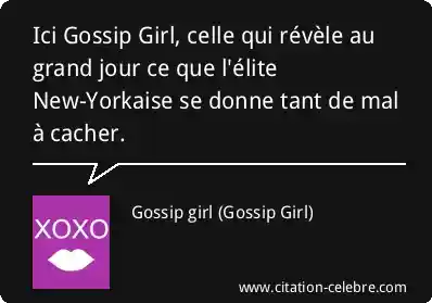 Ici Gossip Girl, celle qui révèle au grand jour ce que l'élite New-Yorkaise se donne tant de mal à cacher.