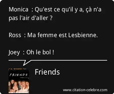Monica : Qu'est ce qu'il y a, çà n'a pas l'air d'aller ? Ross : Ma femme est Lesbienne. Joey : Oh le bol !