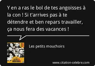 Y en a ras le bol de tes angoisses à la con ! Si t'arrives pas à te détendre et ben repars travailler, ça nous fera des vacances !