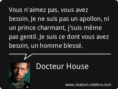 Vous n'aimez pas, vous avez besoin. Je ne suis pas un apollon, ni un prince charmant, j'suis même pas gentil. Je suis ce dont vous avez besoin, un homme blessé.